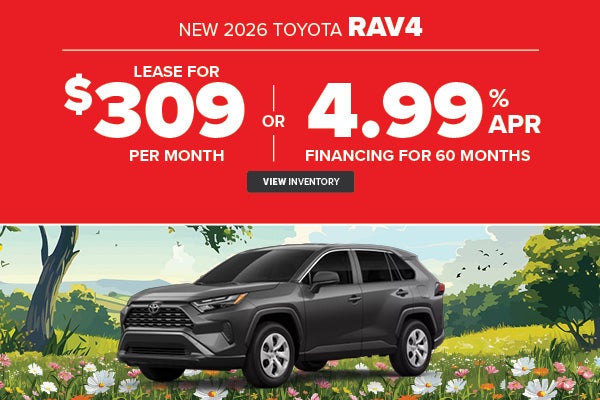 Must be financed or leased through Southeast Toyota Finance (SETF). Qualified customers who finance a new 2026 Toyota RAV4 can receive 4.99% APR for 60 months with monthly payments of $18.87 for every $1,000 financed. Terms available on approved credit through Southeast Toyota Finance (SETF). Must finance through SETF. Down payment will vary. Qualified lessees can lease a new 2026 Toyota RAV4 LE, model #4521, for $309 per month for 39 months with $4308 due at signing. Based on 12,000 miles per year. Security deposit required with exception of prior SETF financing history and/or SETF credit rating in which a security deposit may be waived. Offers are plus tax, tag, title, license, registration, and Georgia Lemon Law fee. Dealer does not charge a dealer fee. Lessee responsible for maintenance, excess wear and use, and will pay $0.18 per mile for all mileage over 12,000 miles per year. $350 disposition fee due at lease end. Offer ends 5/4/26.